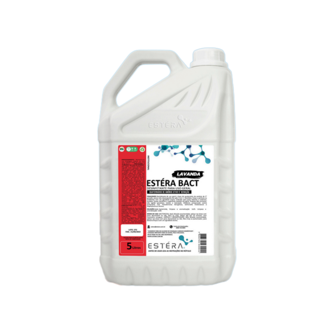 O ESTÉRA BACT foi desenvolvimento a base de Quaternário de Amônio de 5° geração, possui amplo espectro de ação bactericida, desinfetando, limpando e perfumando os ambientes com um agradável aroma. Indicado para pisos internos e externos, azulejos, vasos sanitários e superfícies laváveis em geral. Eficiência comprovada contra as Bactérias: Escherichia Coli, Aeruginosa, Salmonella Choleraesuis e Staphylococcus Aureus